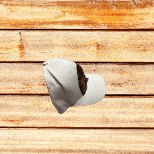 White Trucker Flex Fit Hat w Brown Feathers and Torquoise