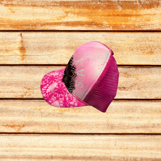 Pink and White Trucker Hat with Feathers with "Say Less"